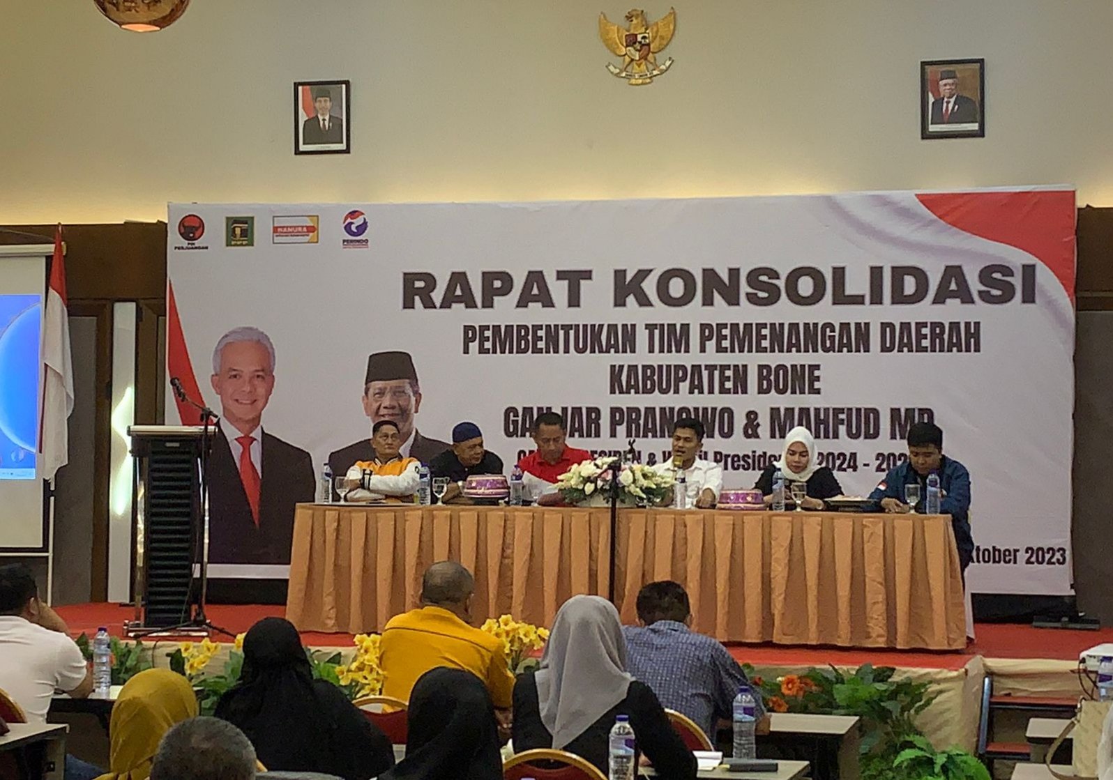 Bone, Global Terkini- Rapat konsolidasi dihadiri para Pimpinan Partai pengusung calon Presiden-Wakil Presiden, Ganjar Pronowo-Mahfud MD digelar di Hotel Helios, Jl Langsat, Bone Sulawesi Selatan, Jumat 20 Oktober 2023.