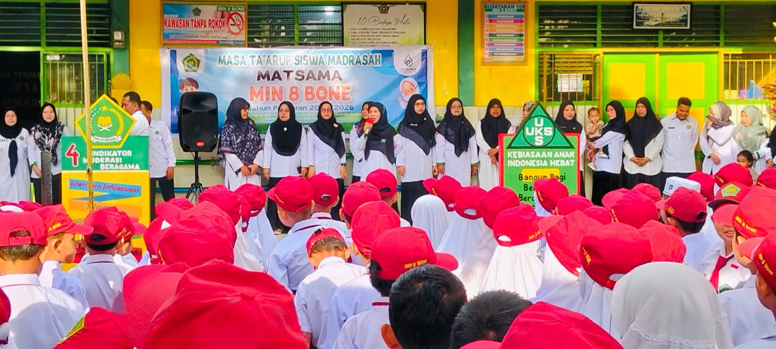 Bone, Global Terkini- Suasana Madrasah Ibtidaiyah Negeri (MIN) 8 Bone, Sulawesi Selatan, tampak semarak di hari pertama sekolah, Senin 14 Juli 2025.