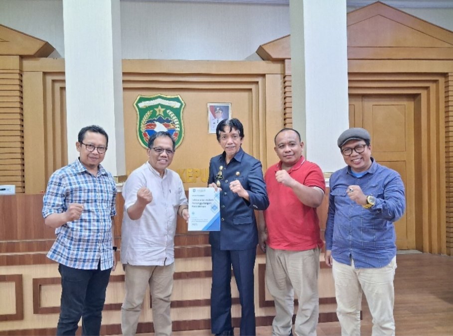 Wakil Bupati Pangkep Abdul Rahman Assegaf bersama Kepala Bapelitbangda Imam Takbir, Konsultan Ahli Nawir Sikki, Junardi Jufri, dan Direktur Lembaga Demokrasi Celebes Sjamsuddin Moedji berfoto bersama usai audiensi penyusunan Modul Panduan Inklusivitas dalam Penanggulangan Kemiskinan, di Ruang kerja wakil Bupati Pangkep, Jumat (8/8). Modul ini diharapkan menjadi pedoman inovatif pertama di Pangkep dengan mengedepankan prinsip inklusi dan kerja kolaboratif lintas sektor.