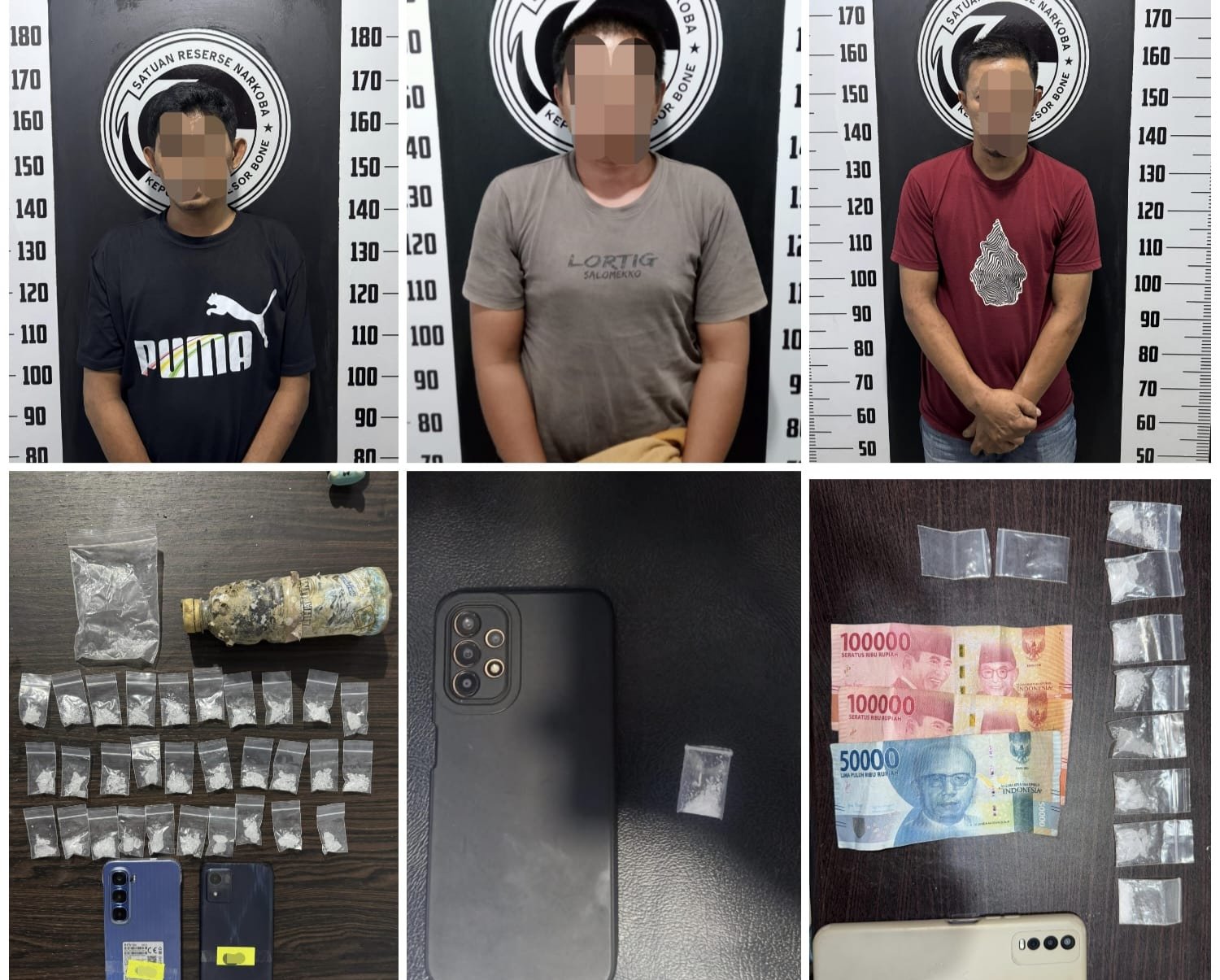 Bone, Global Terkini- Satuan Reserse Narkoba (Satresnarkoba) Polres Bone membuktikan komitmennya memberantas peredaran narkotika. Dalam operasi dua hari berturut-turut, Jumat–Sabtu (12–13/9/2025), tiga terduga pelaku berhasil dibekuk, dengan barang bukti sabu puluhan gram.