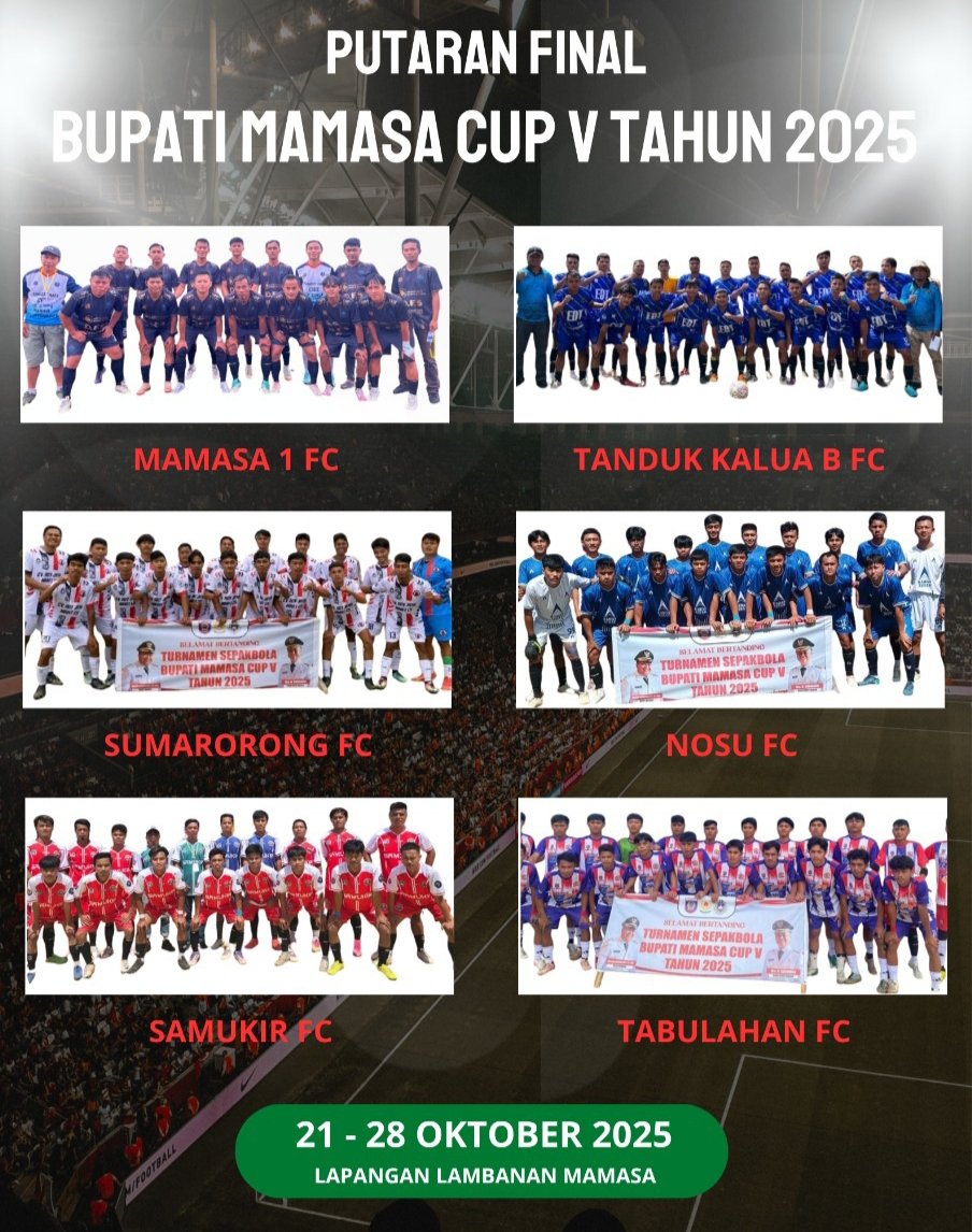 Mamasa, Global Terkini- Putaran penyisihan Turnamen Sepakbola Bupati Mamasa Cup V Tahun 2025 resmi berakhir. Sejak 9 September hingga 2 Oktober, 29 tim yang mewakili kecamatan se-Kabupaten Mamasa telah bertarung di tiga titik, Lapangan Lambanan (Kecamatan Mamasa), Lapangan Pana (Kecamatan Pana), dan Lapangan Mambi (Kecamatan Mambi).