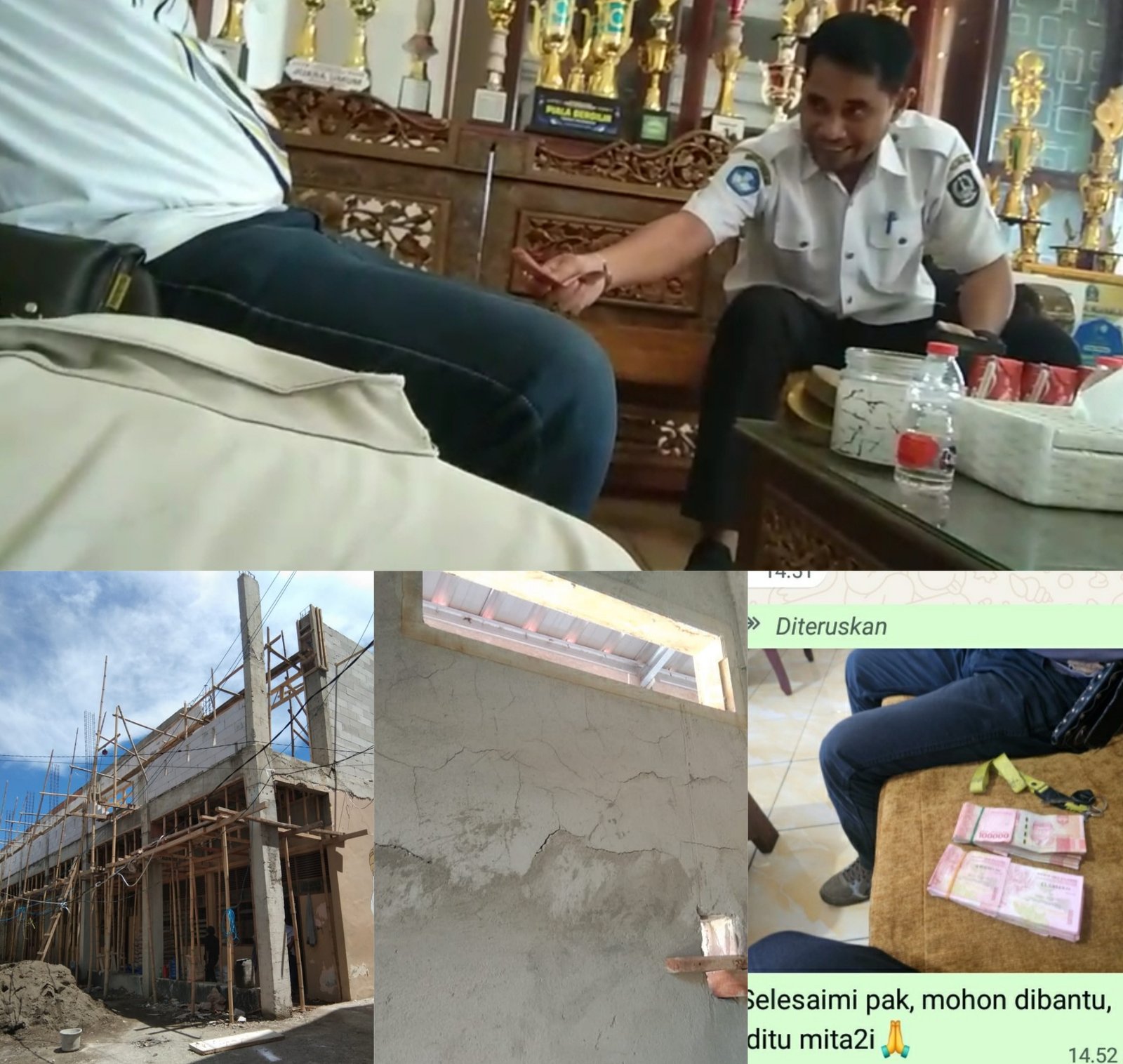 Kolase foto memperlihatkan kondisi bangunan SMKN 1 Watampone yang diduga dikerjakan asal-asalan serta tangkapan layar dari video yang disebut-sebut merekam momen penyerahan uang Rp10 juta untuk “mengamankan” kasus tersebut.