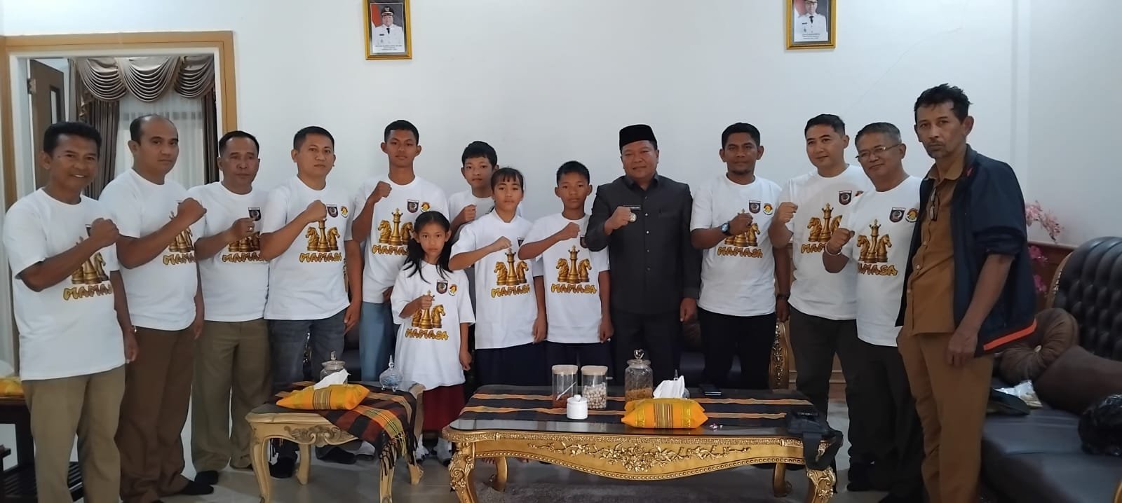 Bupati Mamasa Welem Sambolangi bersama pengurus KONI dan PERCASI Mamasa berfoto bersama para atlet catur yang akan berlaga di Kejurnas Mamuju, usai acara pelepasan di Rumah Jabatan Bupati Mamasa.