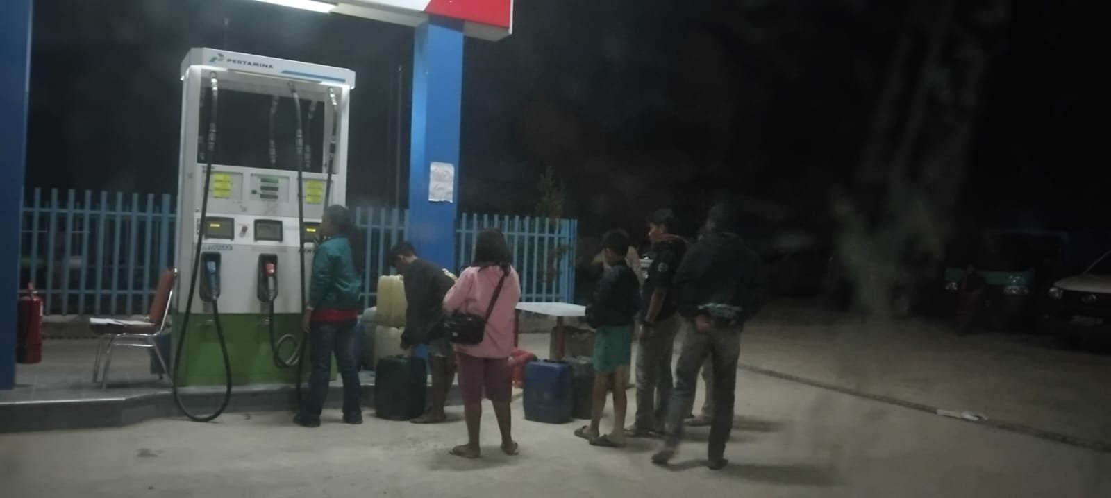 Aktivitas pengisian BBM menggunakan jerigen terpantau di SPBU Lambanan, Mamasa, Selasa malam.