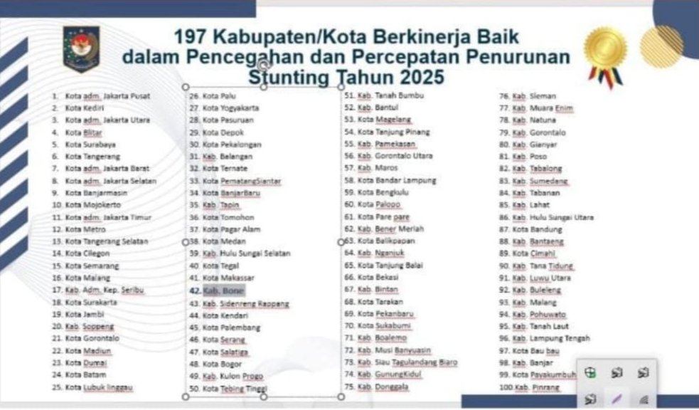 Bone, Global Terkini- Kabupaten Bone kembali mencatat capaian membanggakan di sektor kesehatan. Dalam evaluasi kinerja penanganan stunting tingkat Provinsi Sulawesi Selatan, Bone sukses menempati posisi ketiga terbaik, tepat di bawah Kabupaten Soppeng dan Kota Makassar.