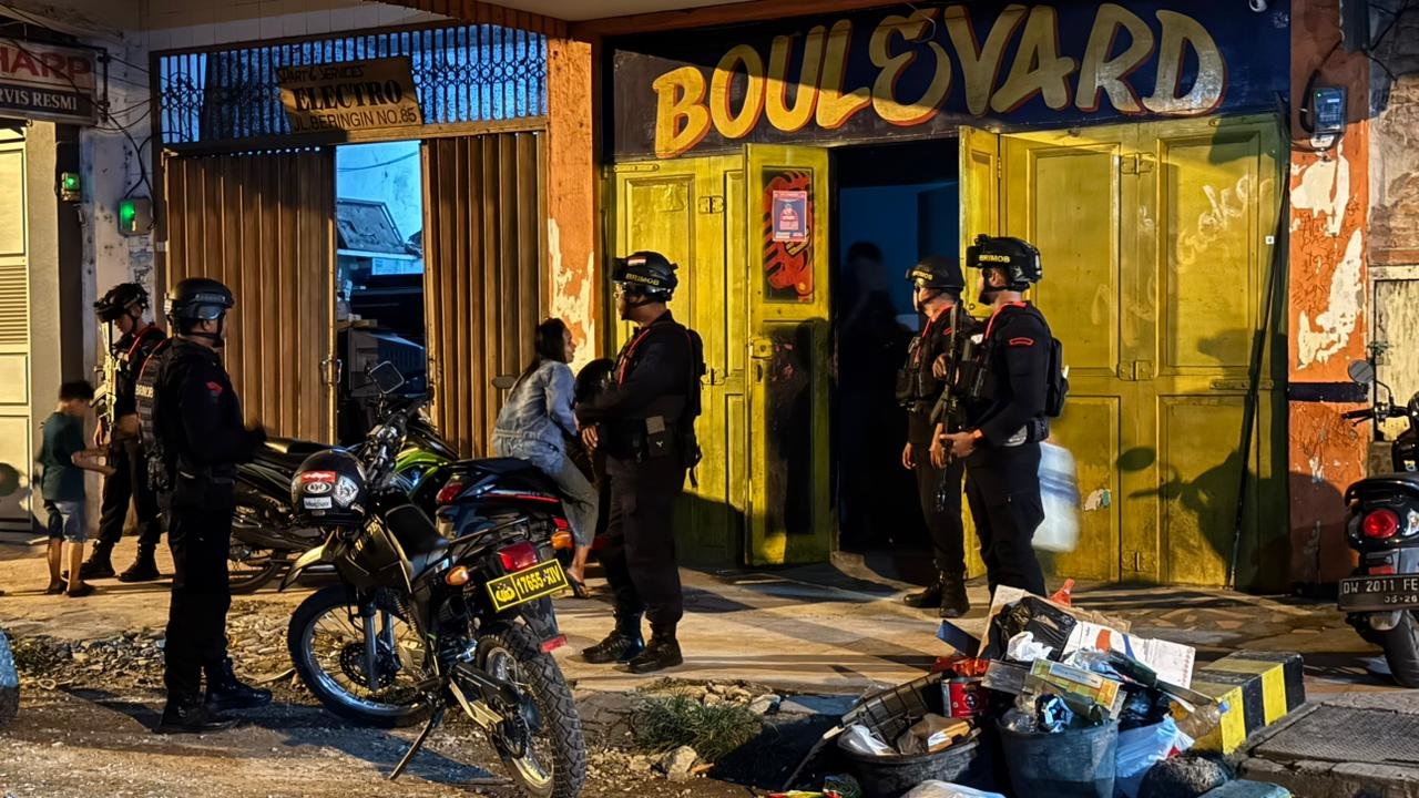 Personel Brimob Batalyon C Pelopor melakukan pemantauan di kawasan tempat hiburan malam (THM) Boulevard, Kabupaten Bone, sebagai bagian dari patroli cipta kondisi.