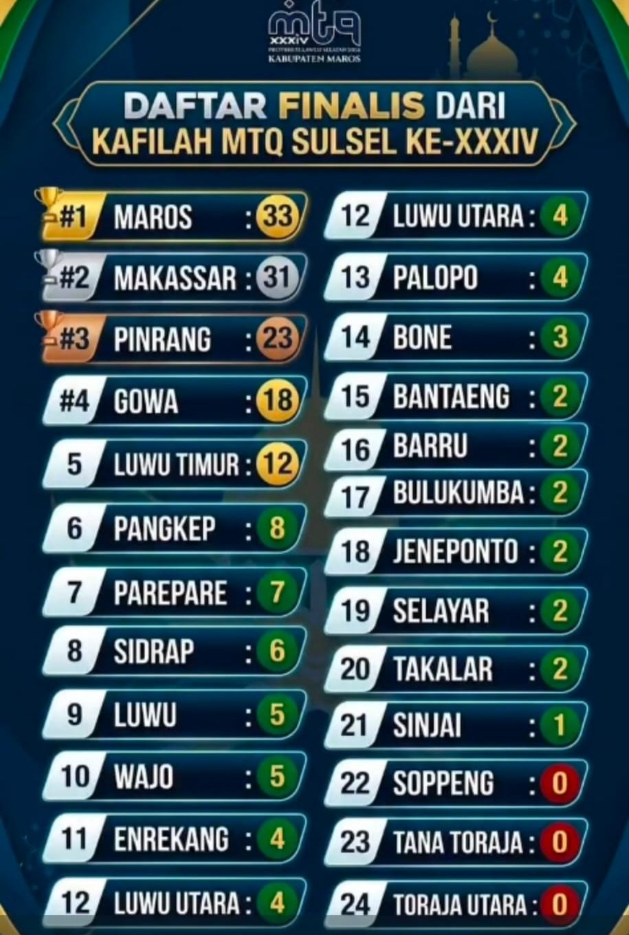 Diketahui peserta MTQ Kabupaten Bone hanya berada diperingkat 14 karena hanya mendapatkan 3 Medali.