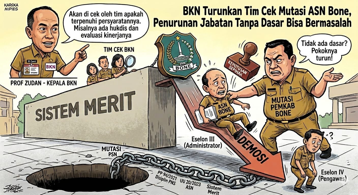 Bone, Global Terkini- Kebijakan mutasi yang dilakukan Pemerintah Kabupaten Bone menuai sorotan. Sejumlah Aparatur Sipil Negara (ASN) dilaporkan mengalami penurunan jabatan dari eselon III (jabatan administrator) ke eselon IV (jabatan pengawas) tanpa kejelasan dasar pelanggaran yang dilakukan.
