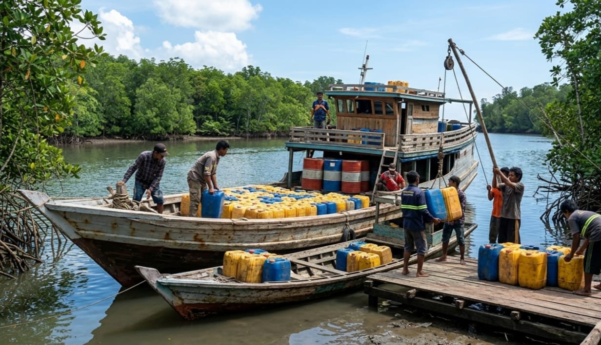 Solar subsidi dikemas dalam jeriken, kemudian diangkut menggunakan kapal melalui jalur laut untuk disalurkan ke pihak tertentu. Skema ini dinilai sebagai upaya menghindari pengawasan di jalur darat.